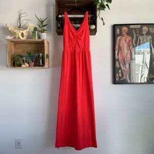 NWOT NEVER WORN. Tart coral hibiscus modal maxi dress with vee neck front, cross back, waist detail, slanted pockets and two 1/4 slots on the bottom hem. Pullover design. Beautiful soft modal fabric with the perfect amount of stretch. Double lined so you can go braless with enough support. Size large