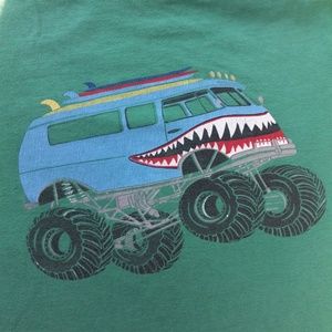 Gap Kids Tee T Shirt Monster Surf Bus Green Crew Neck. Short Cap Sleeves. Graphic Blue Bus with Big Mouth Teeth. Surf Boards. Huge Tires Wheels. Printed Size XL 12.