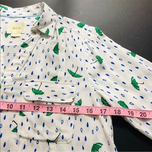 In great used condition Anthropologie button up top by Maeve in size 2 petite. Has super cute umbrella and rain prints. Has two chest pockets. Slightly see through. Please see all photos.