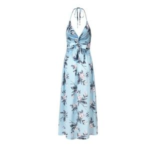 Beautiful, cut out, maxi dress with a halter tie, mid back tie and side slits in the skirt area. This is the perfect maxi dress to wear to the beach or a resort.