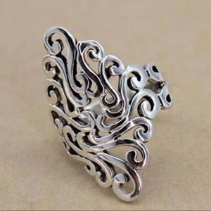 This is a silver tone Adjustable Scroll Ring.