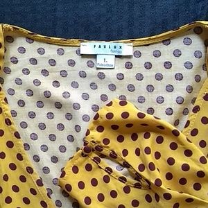 Sexy fit in vintage colors.100 percent rayon. 20" length 24" sleeve. Size is closer to an 8. Mustard gold with burgundy dots.