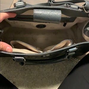 Tory Burch Robinson Ologram Triangle Tote. Color is gunmetal (a metallic grey). Comes with removable strap, dust bag, and original tag. Slightly scuffed on bottom as pictured.