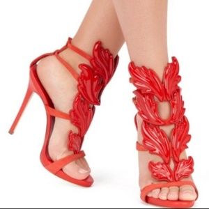 Gorgeous GIUSEPPE ZANOTTI Cruel Coline Wing Heels in Red Suede w/ Patent Wings - Sz 36.5