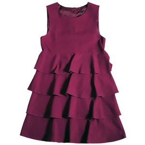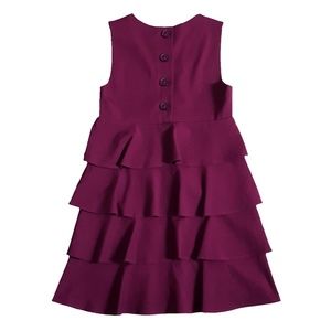 Description: A women's burgundy colored Viscose 4 tiered peplum style, sleeveless dress. Crew neckline. Over sized round plastic buttons up back bodice (lined). Slip under skirt. Falls to around knee (depending on height).