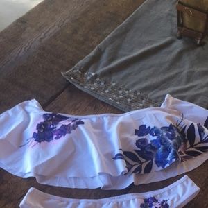 Sexy ruffle off shoulder bikini top floral swim top in white and blues/purples. This is for the top only! (for those that have a different size top than bottom:)) swimsuit features padded bra, ruffle off shoulder design, is not see through, swimsuit stretch material, and athletic cut. I have the matching bottoms and I do sell this as a set as well.Measurements are approx. ✅I ship same or next day ✅Bundle for discount