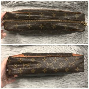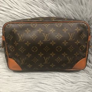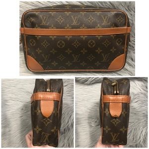 Authentic Louis Vuitton Monogram Compiegne 28 clutch. Preowned condition. This vintage clutch has Scratches and rubbing throughout, mostly on the interior. There are also many pen marks on the interior as pictured.