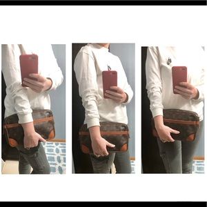 The pockets have peeled and I don’t recommend using unless they’re cleaned or re-lined. There’s a small rip at the end of the zipper line as pictured. Not visible and won’t effect the use of the bag/zipper. The leather trim has been re-painted due to color fading. No dust bag.