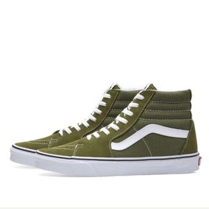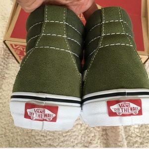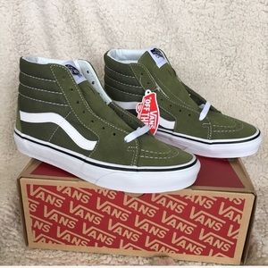 NWT Vans Sk8-Hi Skate Shoe Sneakers in winter moss green. Features green suede toe caps and heels and canvas sides. Laces are true white. Brand new with tag and box. Never worn. Box has some dings. No trades. Size: W 7, M 5.5, euro 37