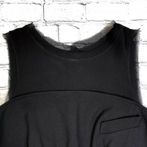 DSquared2 black stretch wool dress. Features sheer upper panel with raw hem, faux front flap pocket details and side zip. Light boning, structured bodice and fully lined.