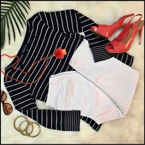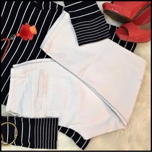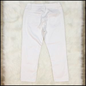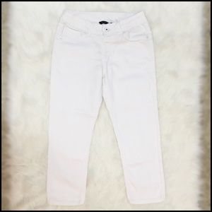 Westbound white, stretch cropped jeans. Length is 31", rise is 9", zipper is 5" and waist is 14". (All measurements were taken while jeans were laid flat.) Features a zipper with a snap closure. Fabric is 75% cotton, 23% polyester and 2% spandex. Made in Kenya. Size S