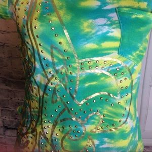 Enjoy this lovely Dereon Top! It's a size M! It's in excellent condition! Gets this top for Summer! Enjoy the design and colors! Its made out of 95% Poly and 5% Spandex. It's about 24.5" in the front and 16" in the back. The Bust is about 16".