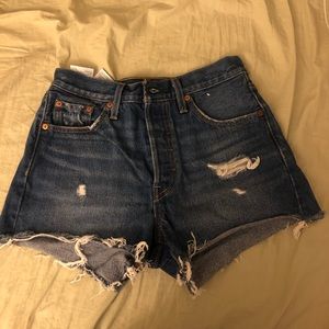 Dark wash, high waisted denim shorts with multiple buttons going up