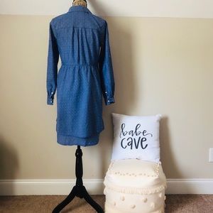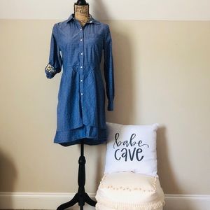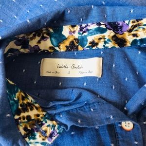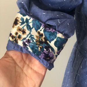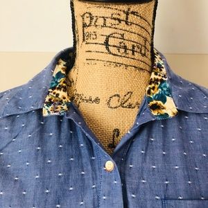 In excellent mint condition-worn once. By Isabella Sinclair, set-in waist, tiered hi-low hem (double tier on front) dart detail all over, roll tab sleeves with floral print (as well as inside lining of neck) front pocket on left of chest, button front, no belt loops. Perfect for a causal weekend activity (was worn to a ballon fest 😎) laying flat approximate measurements: 16” waist, 18” from pit to pit, 37” (longest point)