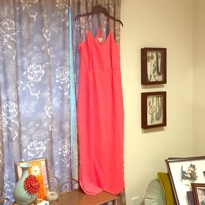 Classic but fun bright maxi dress, only worn once. Bright peach color looks beautiful with tan skin. Perfect for summer, but could also transition into fall with a jean jacket!
