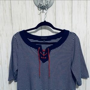 Jones N.Y Natica Striped top size large in excellent use condition, no flaws, this horizontal stripe white and navy top features a crisscrossed red lace on the v neck style and 1” Slip on both sides, super lightweight and comfortable, perfect for this summer.