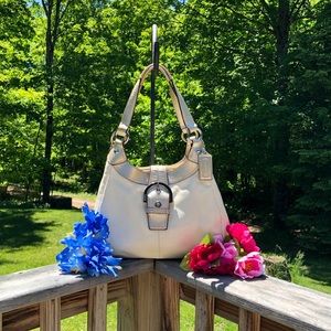 Guaranteed authentic or your money is refunded. Coach ALL LEATHER large size bag. The entire bag is leather. Pic#4 shows the bag next to a reg size 12oz pop can for comparison. Bag is white leather w/silver leather trim. 3-Full Sections on bag. Zipper closure w/ magnetic snap buckle detail. Lots of room for all your goodies plus this keeps things organized. In Great condition. No wear on leather at all including straps. No flaws. Bag has flat bottom as well for more room. Smoke/Pet free