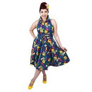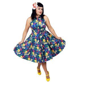 Tropical fun in a Blue Hawaii print!! This lovely dress buttons down the front, has a hidden side zipper, a GIANT full circle skirt, side seam pockets, wide structured collar, and matching tie belt.