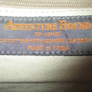 Genuine leather trimed/handles/fabric bag with inside zipper compartment. Cream/Tan, saddle/brown leather trim. Fully lined, zip closure. Base needs cleaning. Approx. measurements: Handles 14” long, 13” W, 11” D.