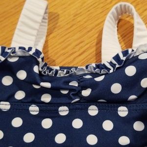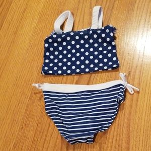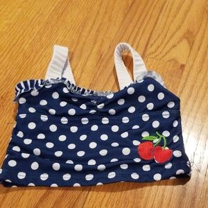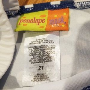 Cute Penelope Mack bikini featuring cherries on the front top. The top is blue with white polka dots and the bottoms are blue with white stripes. Elastic white straps on the top. White elastic band around the bottoms with two sewn side bows. Not pulls or snags in the bikini. Size 2T.