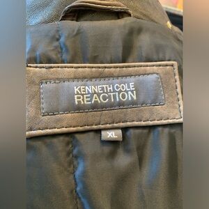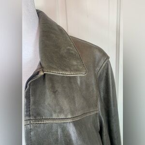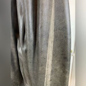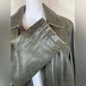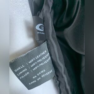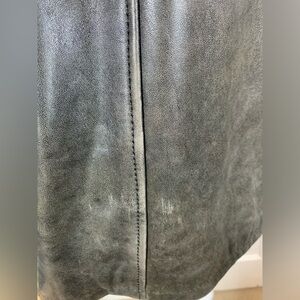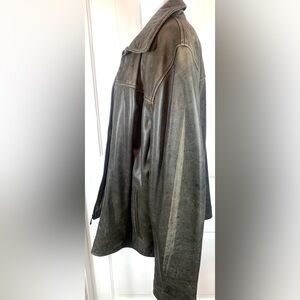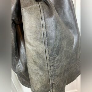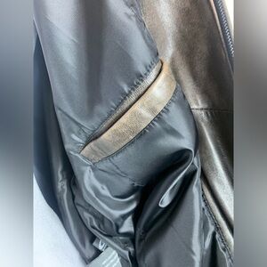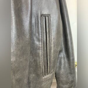 Heavy duty zipper closure. Thick material. 100 % leather shell. Inside and outside pockets. Soft satiny lining. Worn in look. Discolored streak on one arm. Darker mark near chest/collar. See pics and video.