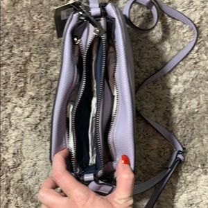 NWT French Connection purse. Beautiful lavender color with lots of zippers and space. Has very small stain on the front that is not noticeable (see photo).