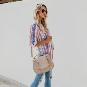 When the sun goes down on your beach day, throw on our Tuscan Skies Button-Up Top over your bikini and light up the bonfire! Warm-weather friendly woven cotton, in a faded multicolored stripe print, forms this comfy shirt with a collared V-neck, relaxed bodice, and long sleeves with buttoning cuffs.