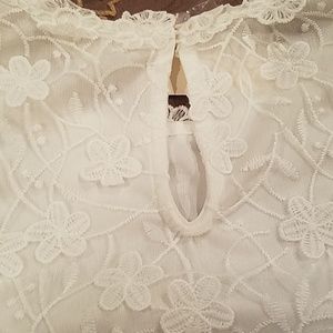 White, sheer floral material. Fully lined. So adorable. Dress up or down for summer. Cardigan over it looks pretty in any season.