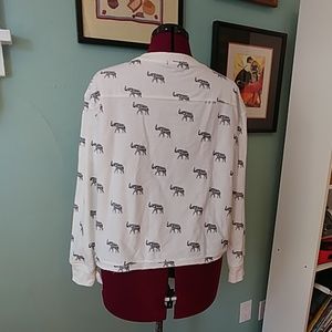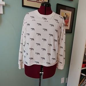This shirt is so soft and cute, but it doesn't fit and I'm not big on crop tops. White cotton-poly blend with a jagged bottom after the hem and black elephant pattern on the fabric. Sort of a cross between a light sweatshirt and heavy long-sleeved t-shirt.