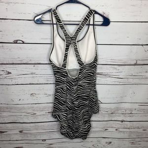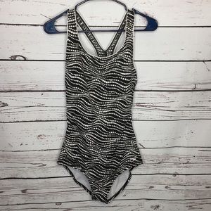 Women’s size 10 speedo ONE PIECE swimsuit, black with white polka dots.