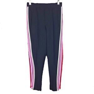 A chic & comfortable trouser with a track/jogger look & feel. Black in color with pink red & white stripes that run down the sides of legs. Cuffed hems. Elastic waist with faux zipper flap. Front pleats with a crease that runs down legs. Single faux back pocket. Two front slash pockets (threading needs to be cut). A pant for any season & can be worn with sneakers or heels.
