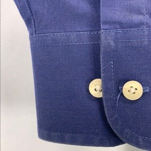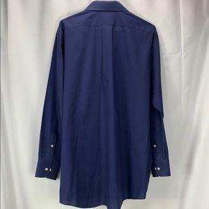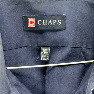 Nice Chaps long sleeve dress shirt in navy blue. One of the buttons on the right hand cuff is cracked. Measurements are: shoulder to shoulder 14”, armpit to armpit 16”, sleeve length 22”, back neckline to hem 32”. Tag reads: 16-16 1/2, 32/33, Large (A-0047)
