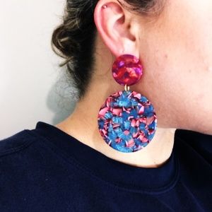 Oversized circle disc drop earrings in a stunning mix of blue and hot pink acetate with a bright pink acetate stud featuring hints of berry.
