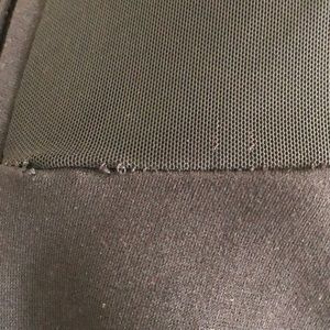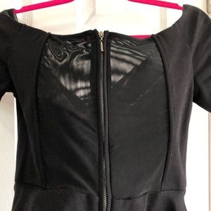 Decent used condition, a few of the stitches came out of the back netting panel near zipper (as shown in photo) but is still wearable, especially with a couple of stitches. Flattering fit and flare shape with sassy net panels at neckline and back. Pit to pit measures 16.5-17 inches. Waist to hem measures 16.5 inches