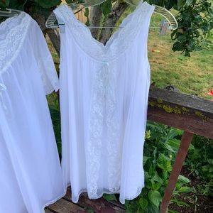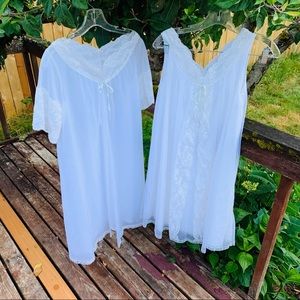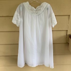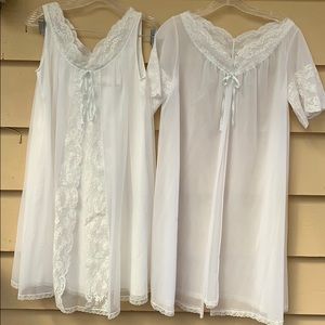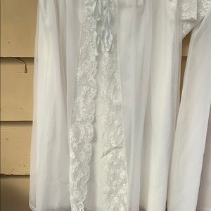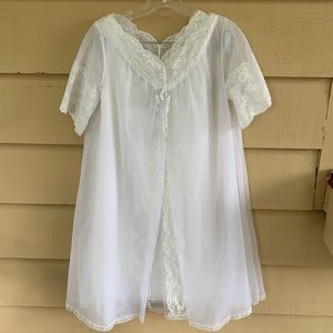 This has sold do not buy. Vintage 60’s 2 piece all nylon, by Shadowline. White with very soft blue ribbons. Beautiful lace work. Near perfect condition. One of the buttons in the robe will need refastened with a few stitches.