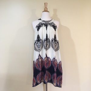 Light, flowy fabric, abstract floral navy and cream print, mock halter with a keyhole tie back design. Chic mini length with a loose, retro mod fit.