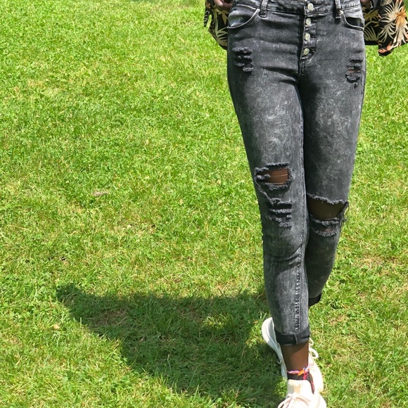 Black Grey Ardene Skinny Jeans with Rips. Slightly high waisted with a tight fit, and stretchy waist. Gently used, in mint condition. Please, see photos for more details!
