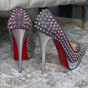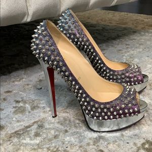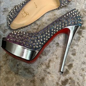 Christian Louboutin Lady Peep Spike Silver with Purple Blue Metallic with silver heel