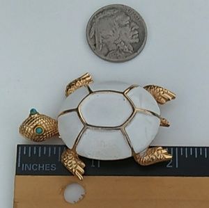 Adorable UnSigned Mid-Century Vintage Gold tone white Enamel turtle brooch pin w faux turquoise eyes.. Min-normal wear, consistent w age, (light surface wear, patina) Overall Excellent Vintage Condition!