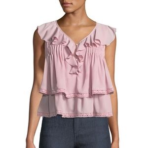 Rebecca Minkoff tiered ruffled top with pintucking & crochet trim.