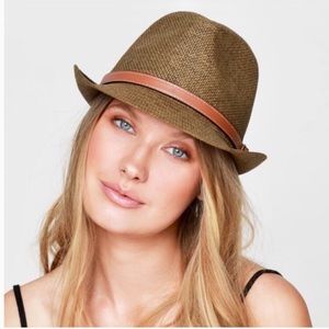 New! Classic olive fedora with vegan leather belted accent.