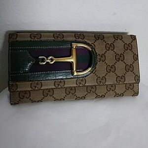 Gucci wallet with signature horsebit buckle and stripe. Features 7 credit card slots, 4 inside compartments and outside pocket with snap closure. Preworn but in great condition.