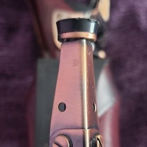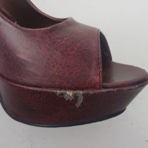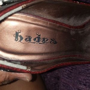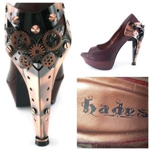 Hades is a beautiful collection of intricately designed shoes made not only with elegance but a dangerously addictive sex appeal. Custom steampunk metallic plated heel w/ butterfly logo & gears. Thundra PU material (vegan leather) platform peep-toe 5" pumps. Scuff on inner left shoe, not seen when worn. A few scratches on the platform as well. Please view all images. Probably shoe paint could cover if this is a concern. They are burgundy in color, a wine color. These are DISCONTINUED.