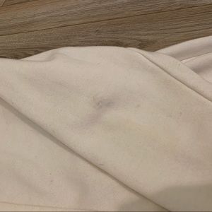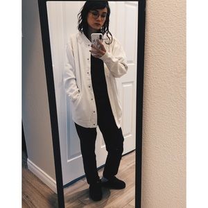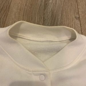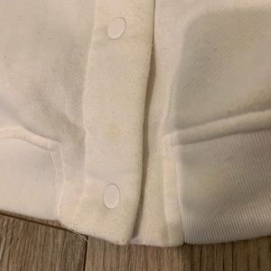 Really awesome and cozy fleece jacket. Kind of an oversized letterman style jacket. Has side pockets and snap buttons. Has some pilling inside, and a couple small stains but otherwise in good condition.