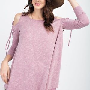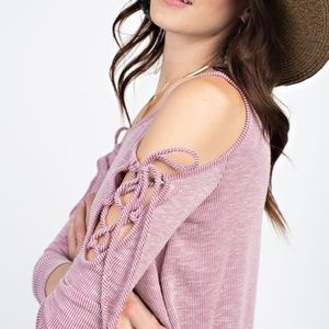 A stretchy, long sleeve, cold shoulder tunic top & lace up sleeves from Easel has a slight two-tone slub, rib knit, & loose fit