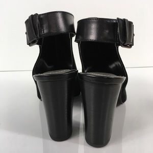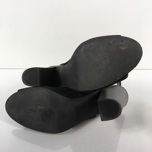 Tahari black suede Margaret open toe shootie. Black stacked wood block heel. Leather ankle strap with buckle. Light suede wear. Heel measures 3.75”. Size 8.5.