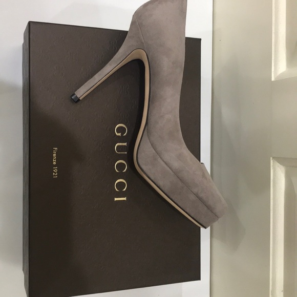 Absolutely stunning Gucci heels, never been worn. Absolute perfect condition. Gray/putty suede, 4.5” heel platforms. These are to die for!! Still in original packaging, come with dust cover bag.These shoes would sell for $1300 +now.