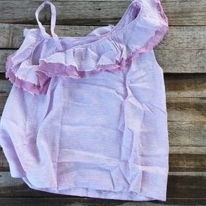 Light purple and blue striped one shoulder Ruffled Linen top by Holding Horses from Anthropologie, size large in EUC. Top is made of linen and has raw H=hems on the ruffles.