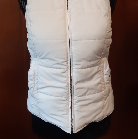 Tommy Hilfiger white with gray lined vest. Full zipper, two outer pockets, one inside pocket. Condition is very good with some wash wear. Pilling. Measurements are in the photo section. I wash my clothes before I sell them. Feel free to contact me with any questions that you may have. Thank you.