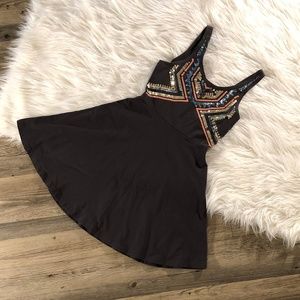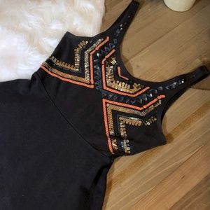 Features sequin embellishment along the bust in a aztec boho like pattern in shades of blue, gold & orange, scoop neck & thin straps